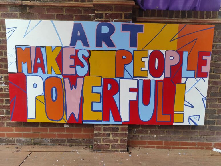 During Enrichment Week two groups of Year 9 students worked together to produce two large scale murals to brighten up our Art Terrace. The murals were inspired by the work of the artist, Bob and Roberta Smith, who creates placards and murals to highlight the plight and the importance of art education for young people. The students created their own placards with their messages about what art means to them and contributed to a large mural, with additional help from two Year 12 work experience students from Fort Pitt school. I will be the first to admit that art teachers can be a little geeky about paint but it was important to use the right materials great finish - we used Masterdec decking paint, which created bright, opaque colours which are intermixable and waterproof - they were perfect for the task - we were supported by Brewers Decorating Centre in Maidstone, who gave us great advice and a discount on the materials to help the project become reality. Huge thanks go to them for their help. The murals look fantastic and certainly brighten up the space. We hope the messages they contain will help to inspire students for years to come! AJS
